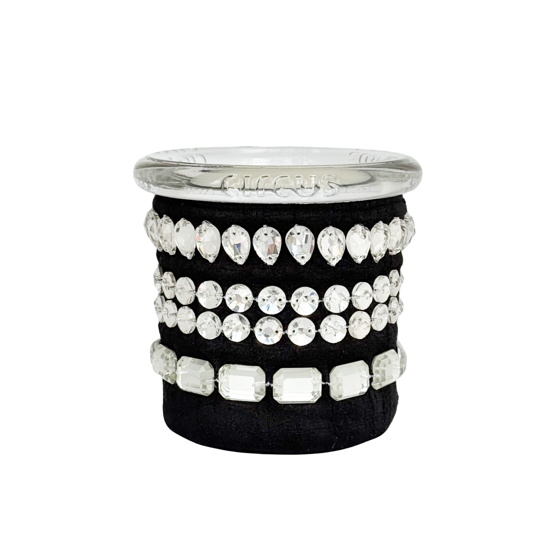 • Wrapped in 100% handwoven silk with oversized clear crystal jewels.