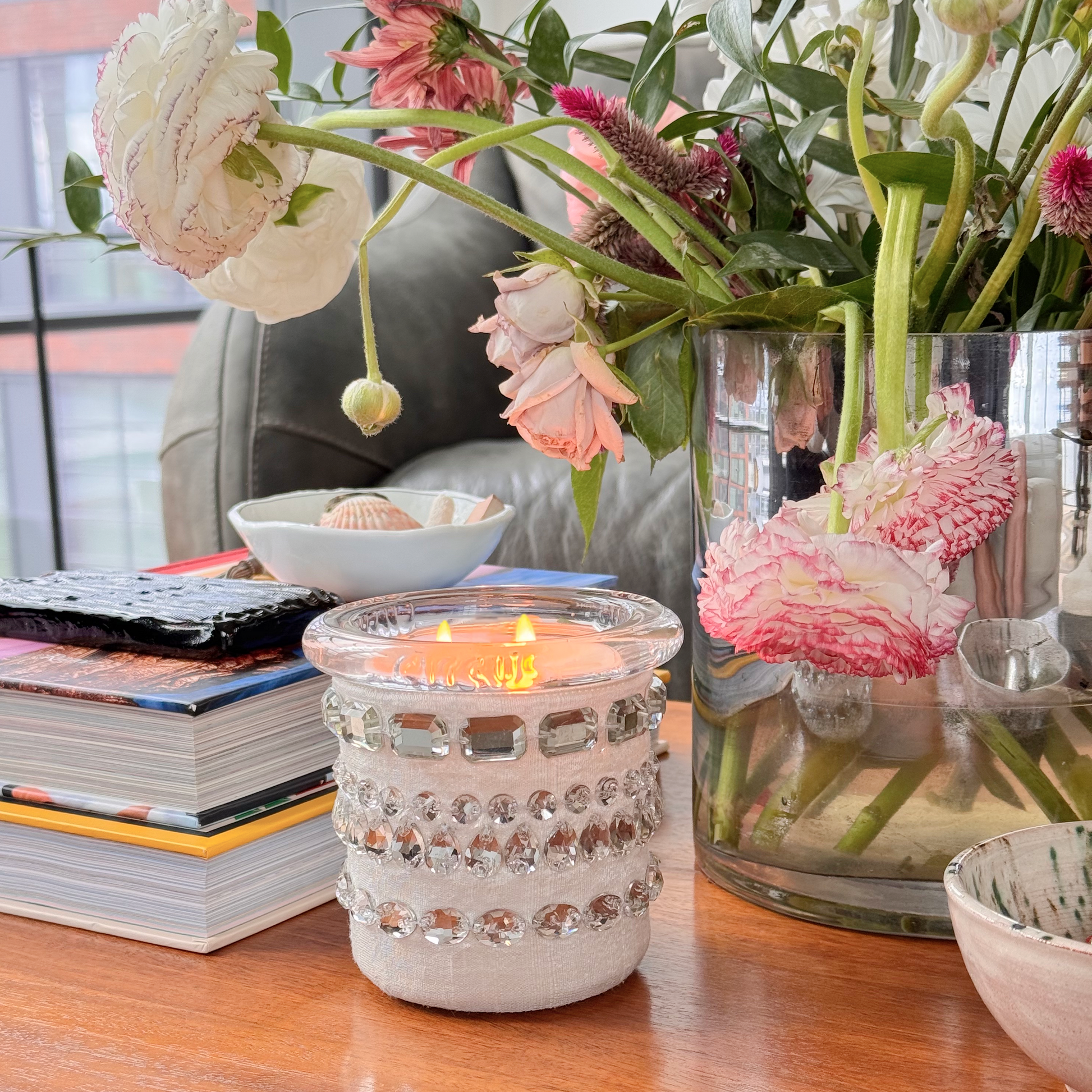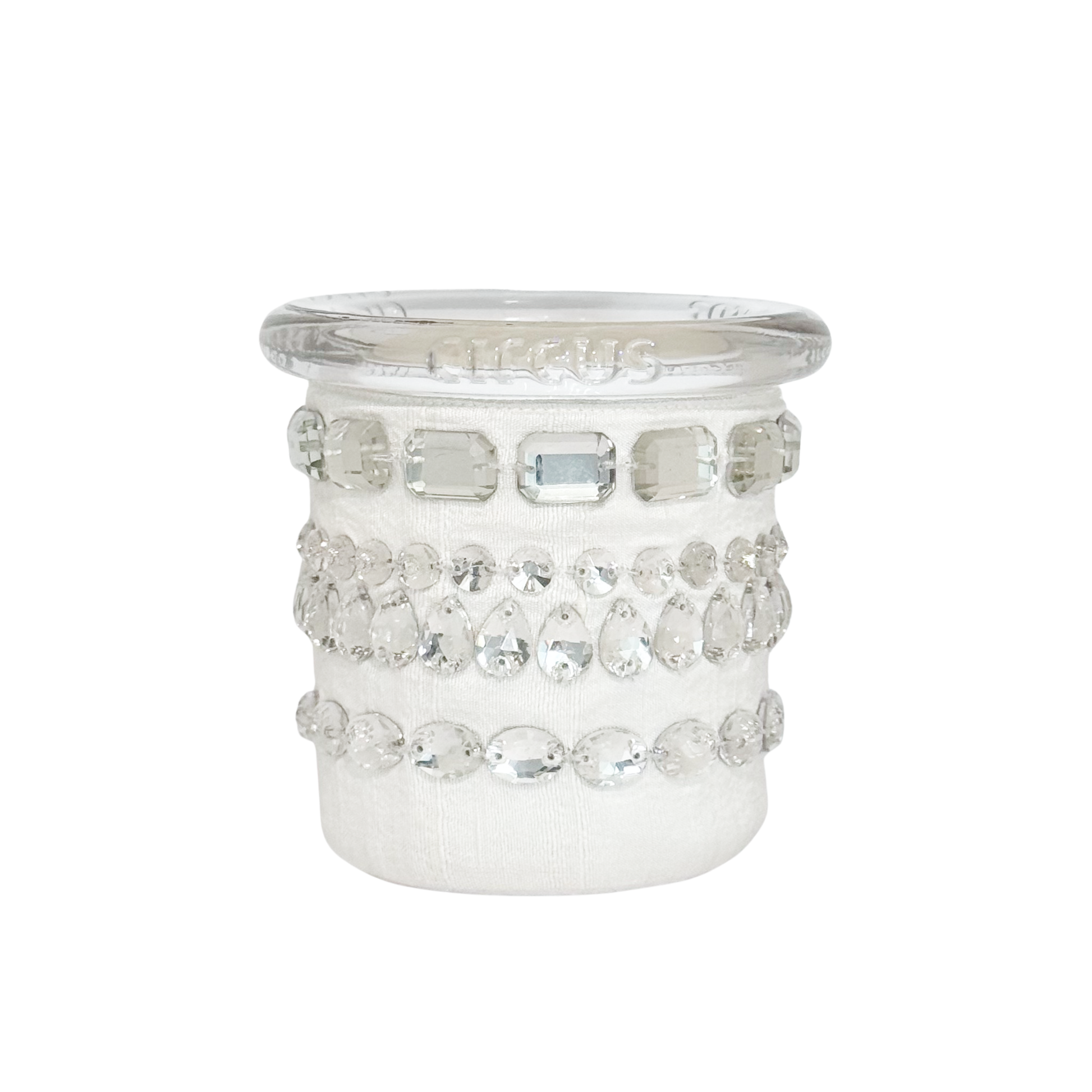 • Wrapped in 100% handwoven silk with oversized clear crystal jewels.